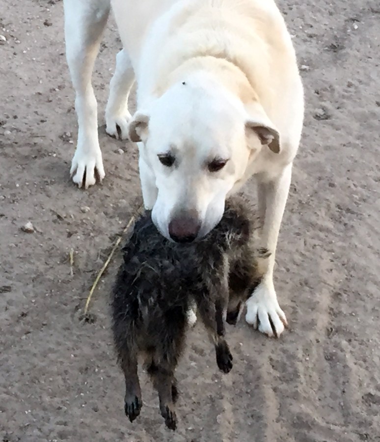 Shadow takes care of an uninvited raccoon.