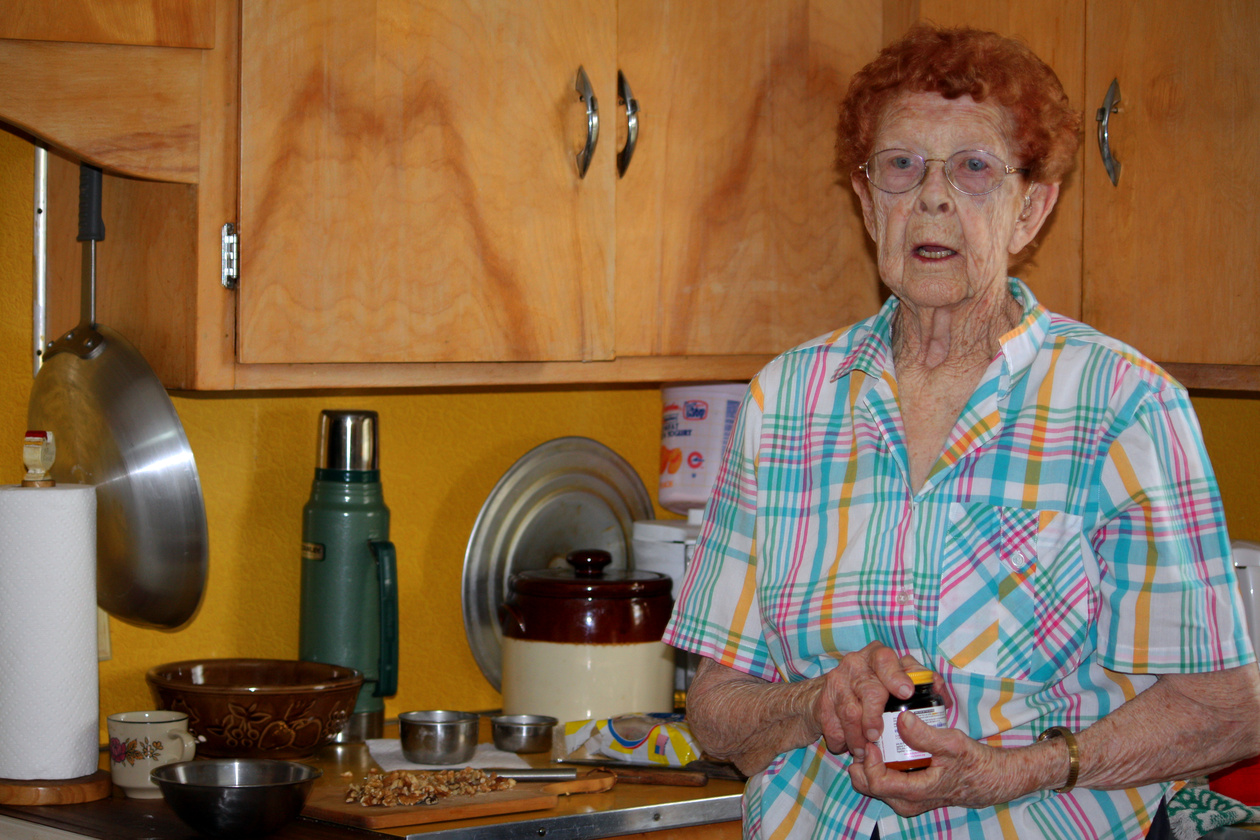 1) “Now why we’ve got the dough going we are going to get our nuts ready. Chop these up. Don’t chop them too terrible fine. What you’re doing looks good.”