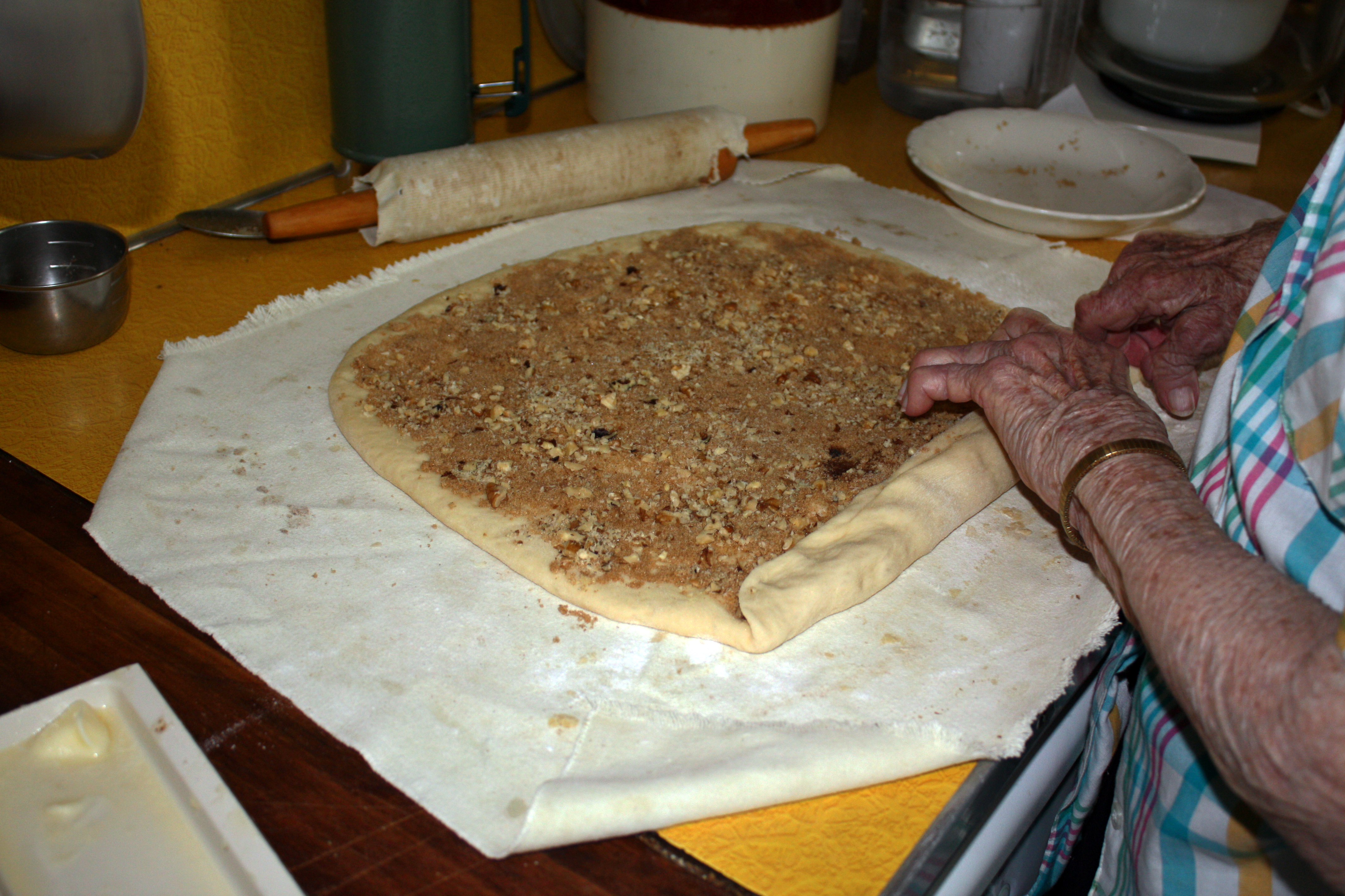 4) She then rolled the dough up and said. “I’ll get some cold water and wet the edges of the dough so it will stick when i pinch the rolled-up dough together.”