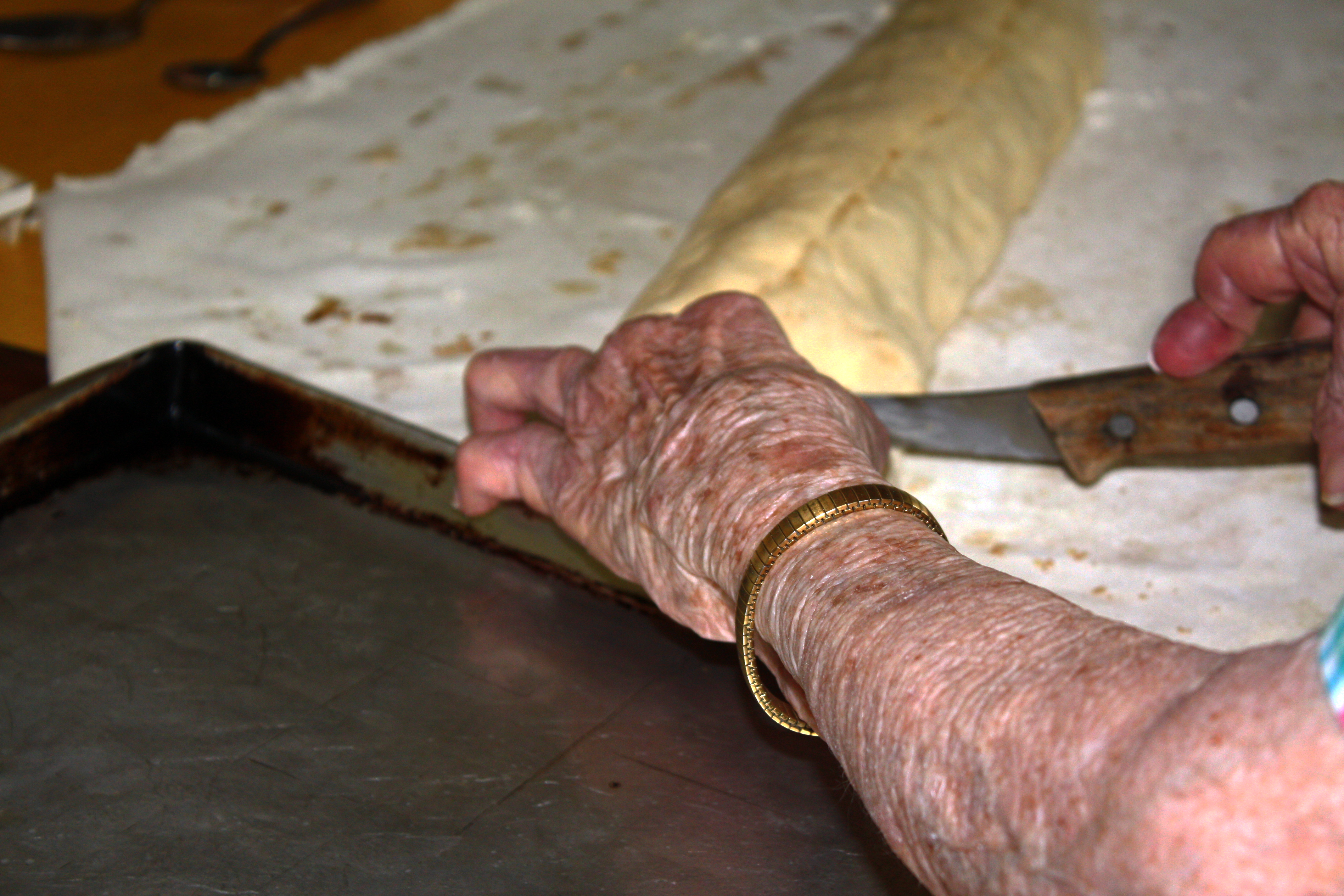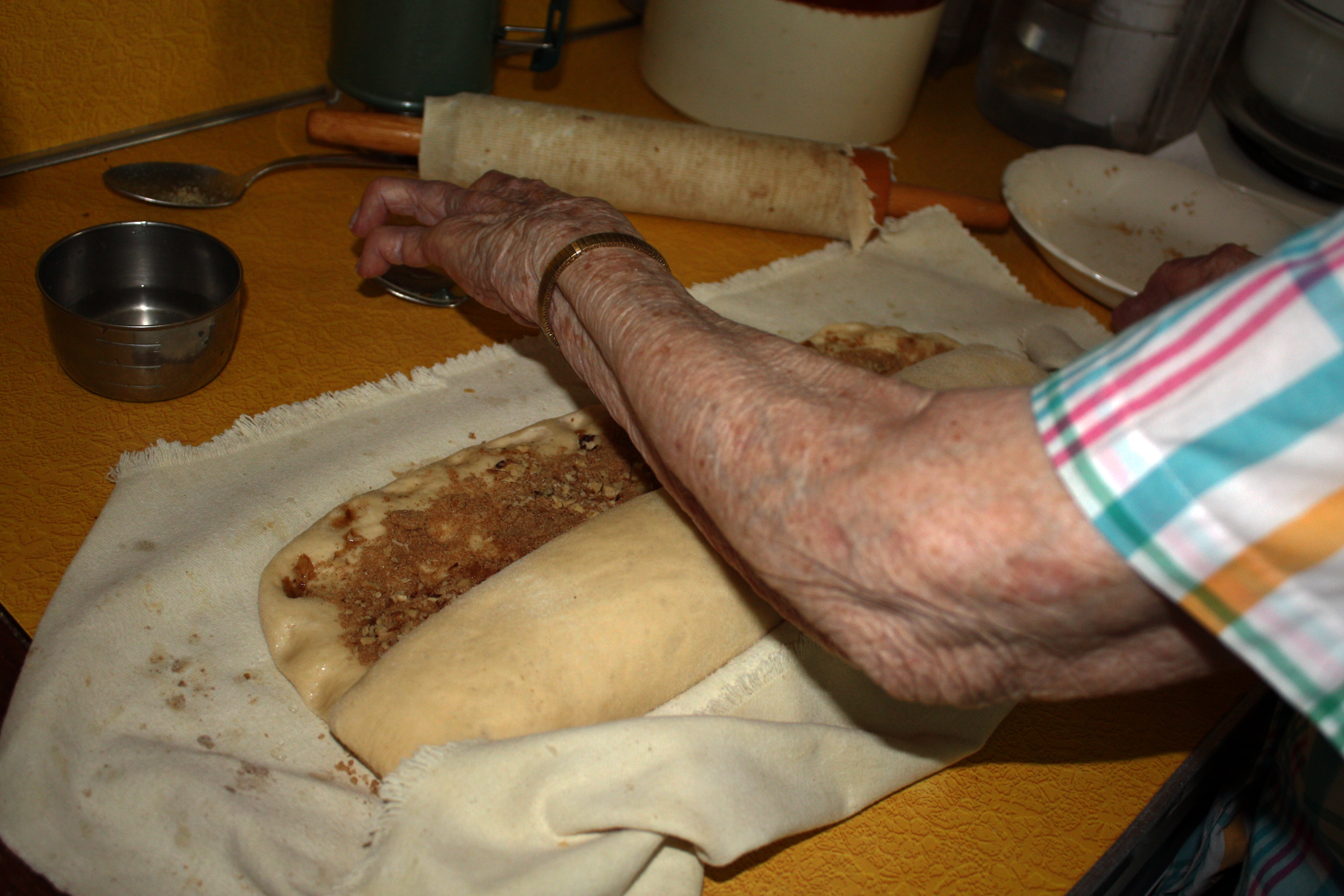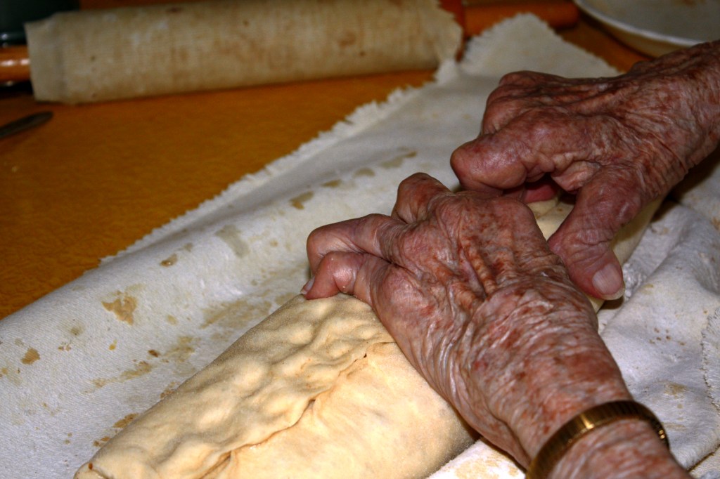 “Always use an old cloth to roll the dough out on, that’s the best way to roll it up.”